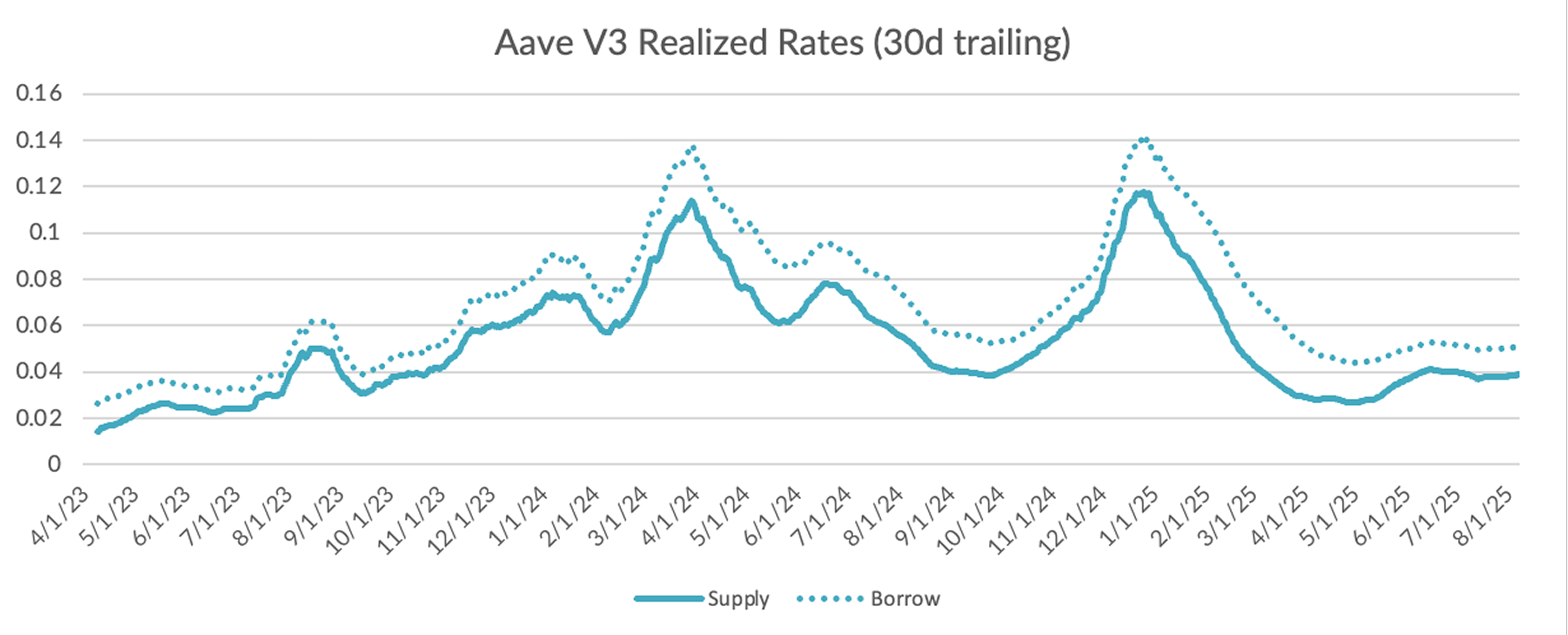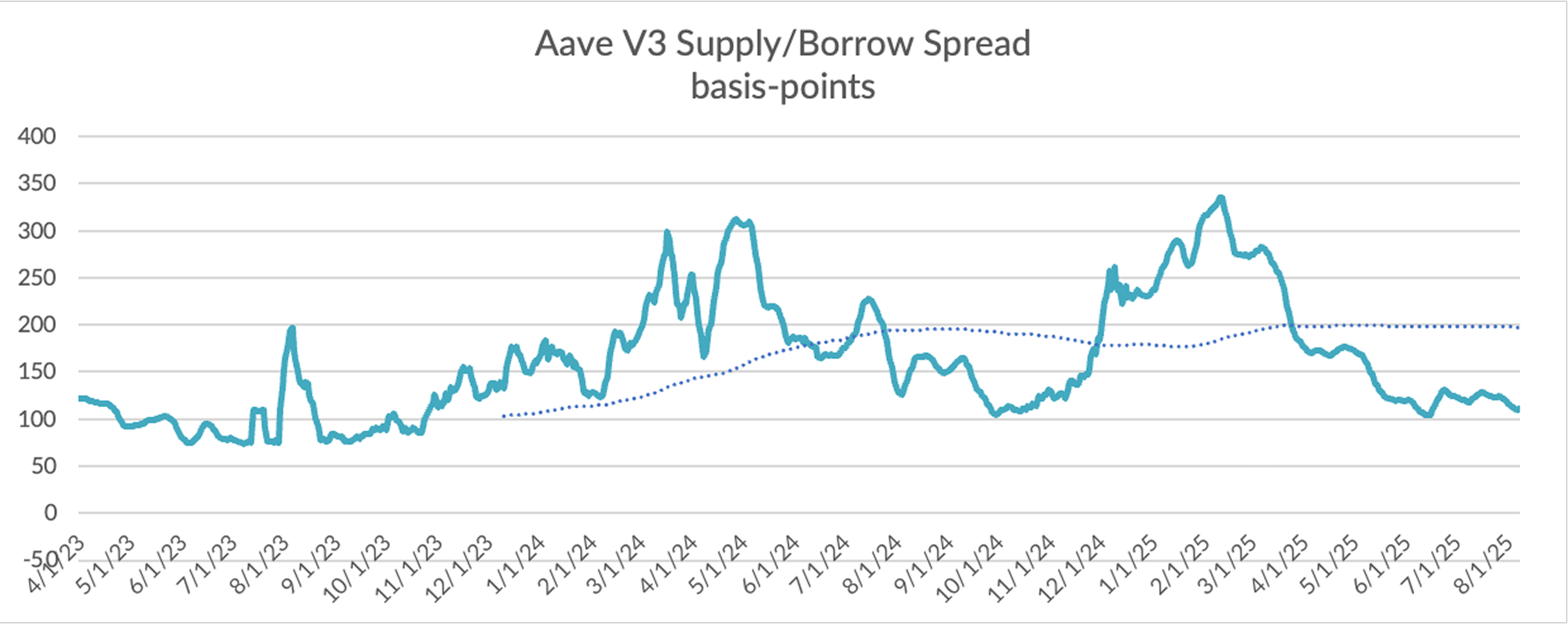 The ‘animal spirits’ of the ETH community is beginning to pick up with ETH outperforming BTC handily week on week (+2.85% vs. +16.26% for ETH). This narrative is boosted by recent developments in U.S. regulatory clarity via passing of the Genius act that promises to increase stablecoin adoption in the U.S. Nevertheless, 3-month basis remains steady in the 6-7% range and perp rates are declining sharply due, in part, to Ethena’s rapidly increasing balance sheet. Aave USDC market exhibit a similar trend of suppressed DeFi rates, given its seemingly endless supply of below market USDC liquidity. One theory is that DeFi has long enjoyed elevated yields driven by a “risk premium” for operating in a niche, early-stage market. As stablecoins gain broader adoption and mainstream participants grow more comfortable allocating to DeFi, this premium may compress—ushering in a new era of tighter spreads and structurally lower yields.