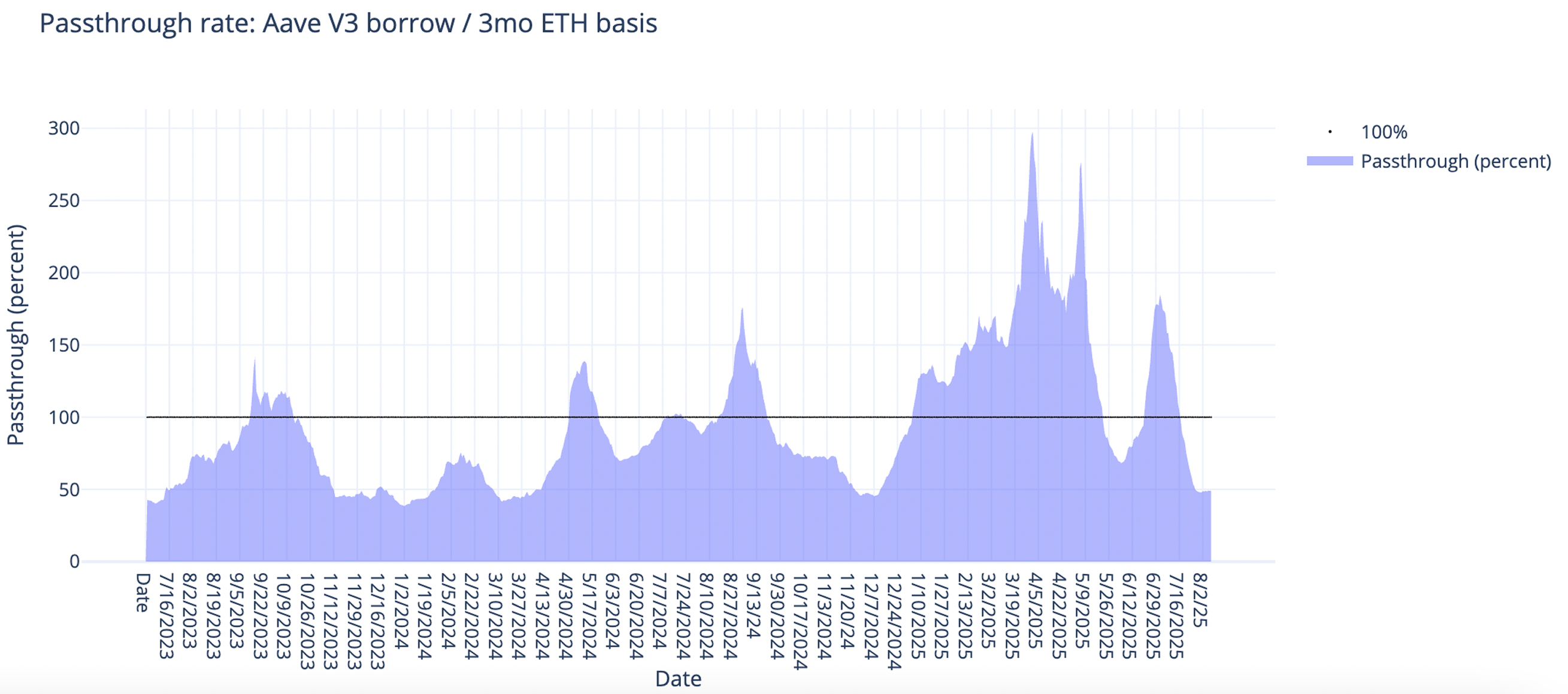 DeFi rates, on the other hand, have been relatively stable, causing the spread between DeFi and derivatives to stabilize
