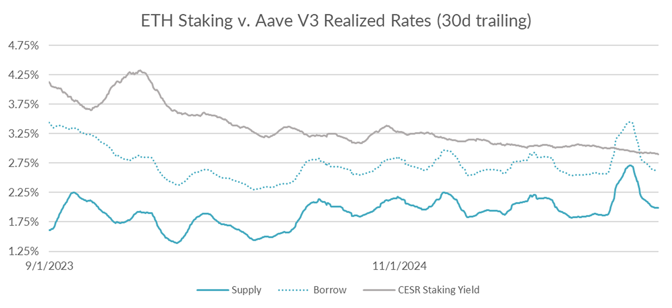 Turning now to ETH markets, ETH rates fell -2bps to 2.62% on a 30-day trailing basis over the past week. The CESR staking index, similarly closed down -2bps on the week at 2.92%, keeping the spread at a historically skinny 30bps.